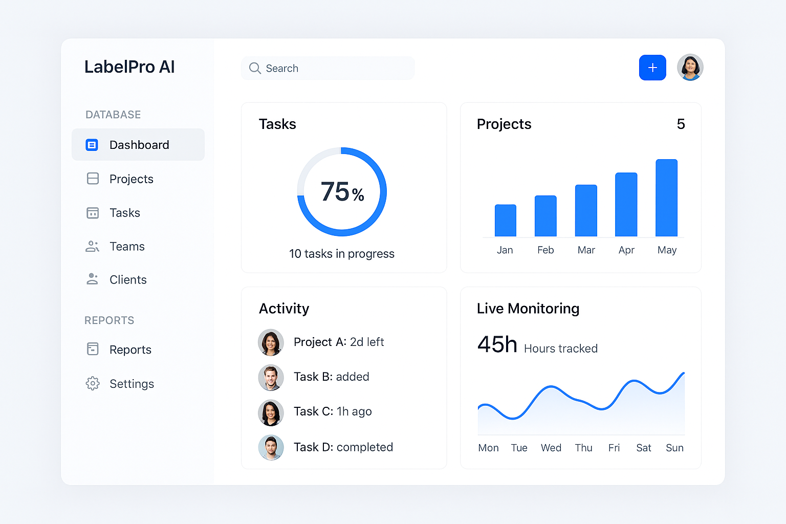Yes. LabelPro AI includes live monitoring features, allowing clients to track task progress, hours worked, and team activity in real-time.